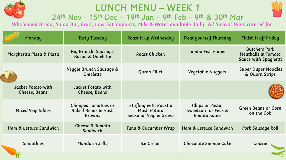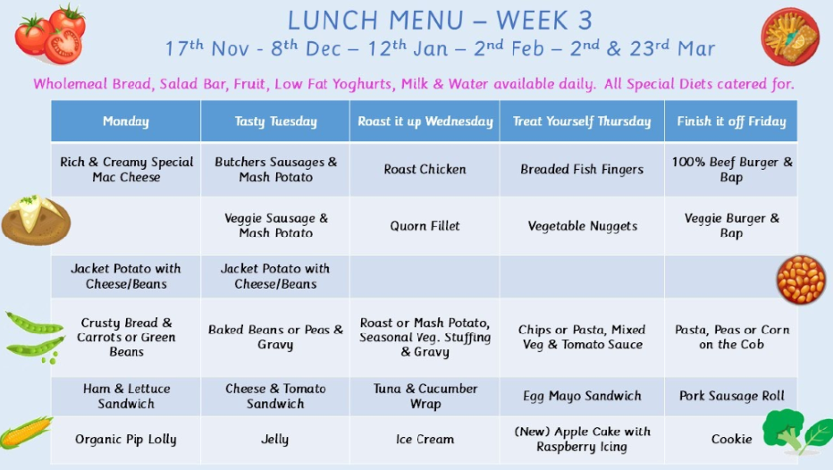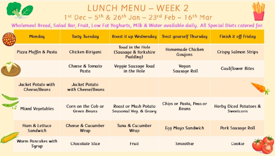 If your child has a dietary requirement (gluten, dairy or vegan) please contact the school office for a Free From Menu. Our Kitchen Manager is happy to talk to parents of children with food allergies.